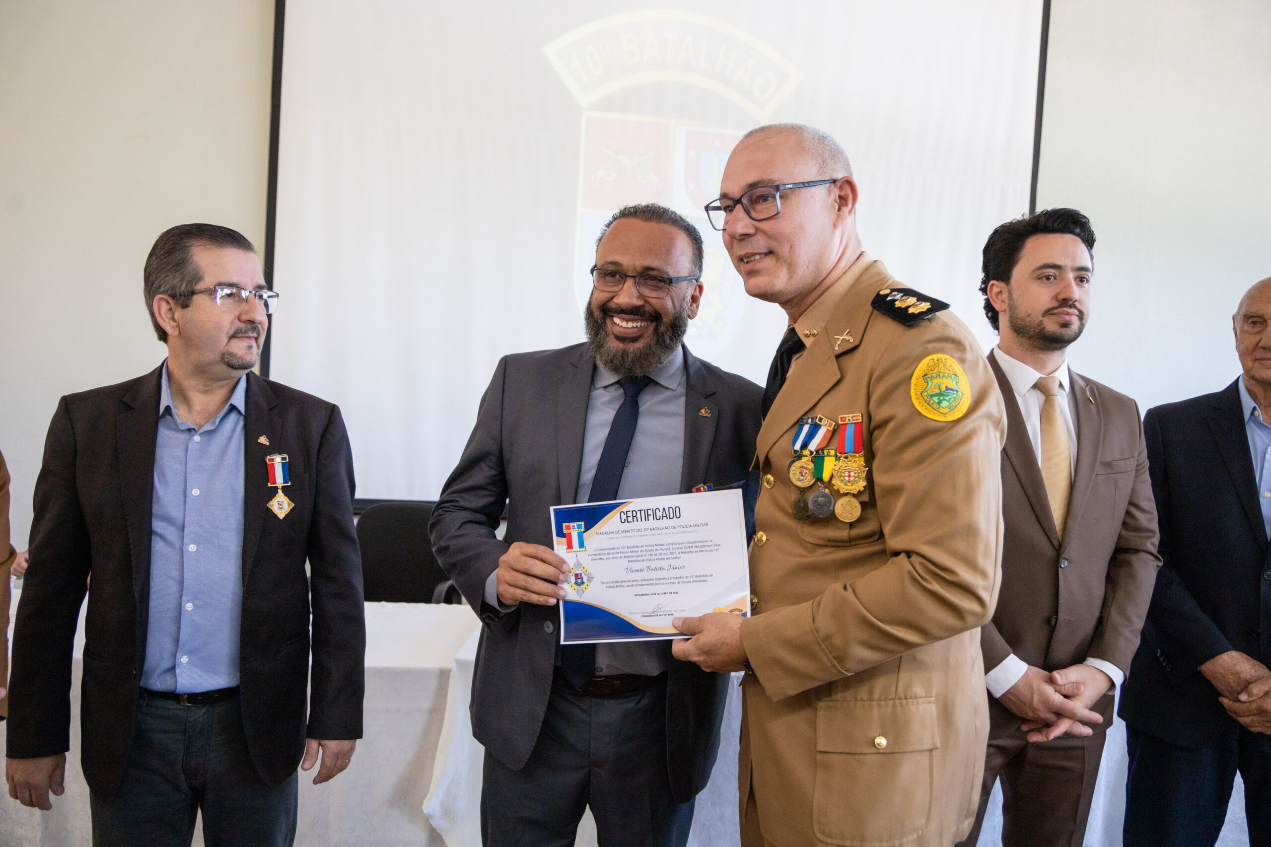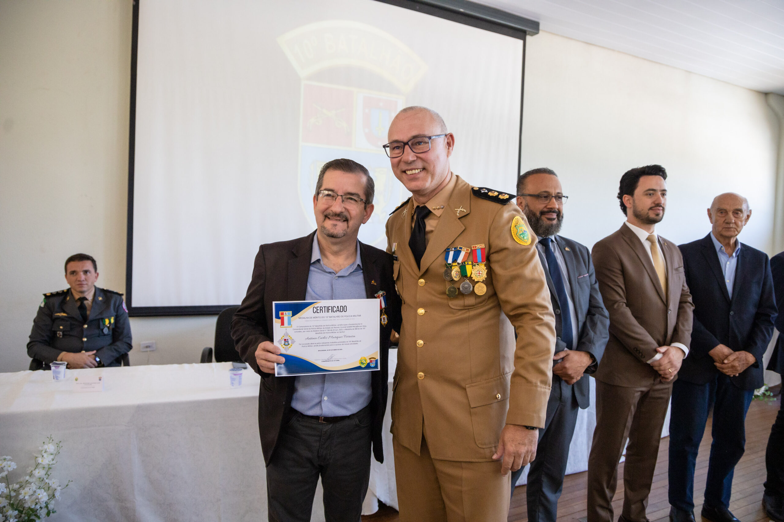 O presidente do Conselho Comunitário de Segurança (Conseg) de Apucarana, Vicente Batista Júnior, foi um dos homenageados com a Medalha de Mérito do 10º Batalhão de Polícia Militar (BPM), durante a solenidade que celebrou os 48 anos de fundação do batalhão, realizada nesta sexta-feira (24/10), no auditório da Unespar.